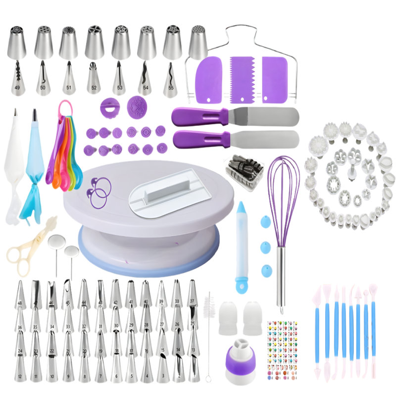 Το Σετ Ζαχαροπλαστικής 176 τεμαχιων με Περιστρεφόμενη Βάση διαμέτρου 18cm περιλαμβάνει 176 τεμάχια και αποτελεί ενα ολοκληρωμένο σετ ιδανικό εξοπλισμό για επαγγελματική διακόσμηση τούρτας ή cupcake. Η περιστρεφόμενη βάση παρέχει άνετη πρόσβαση σε όλες τις πλευρές του γλυκού για ευκολότερη διακόσμηση. Το σετ περιλαμβάνει όλα τα απαραίτητα εργαλεία και αξεσουάρ για να δημιουργήσετε εντυπωσιακές γαστρονομικές δημιουργίες, καλύπτοντας τις ανάγκες της ζαχαροπλαστικής με επαγγελματικό τρόπο.