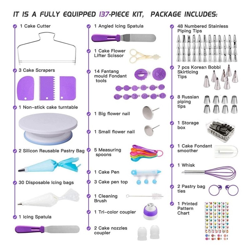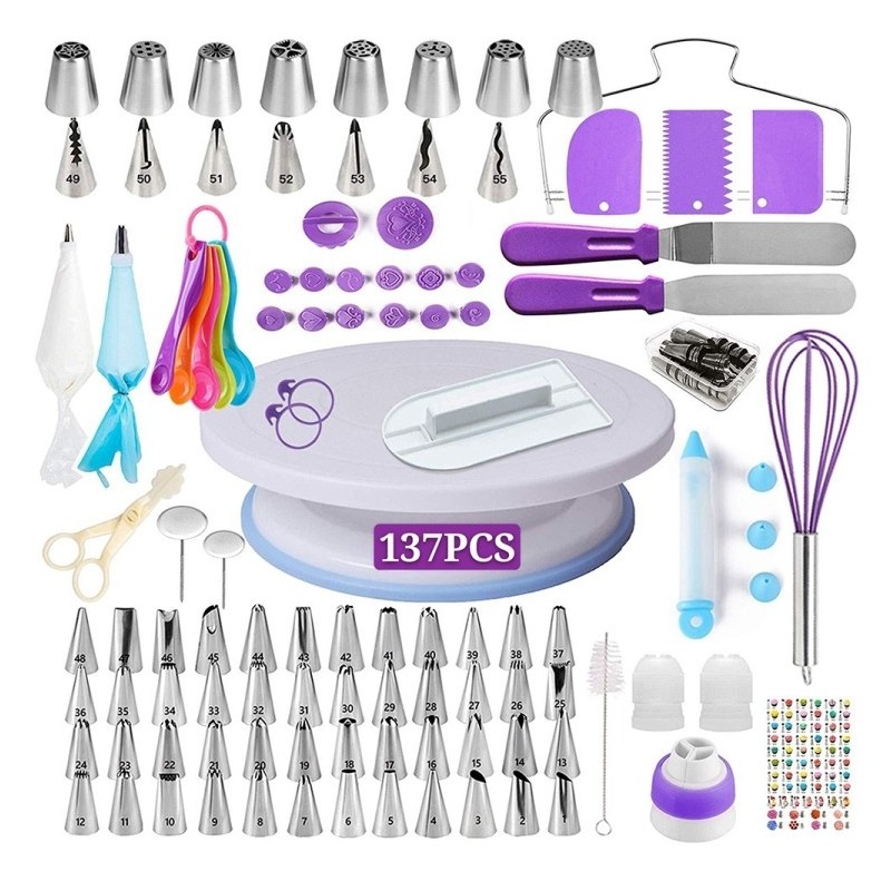 Το Σετ Ζαχαροπλαστικής 176 τεμαχιων με Περιστρεφόμενη Βάση διαμέτρου 18cm περιλαμβάνει 176 τεμάχια και αποτελεί ενα ολοκληρωμένο σετ ιδανικό εξοπλισμό για επαγγελματική διακόσμηση τούρτας ή cupcake. Η περιστρεφόμενη βάση παρέχει άνετη πρόσβαση σε όλες τις πλευρές του γλυκού για ευκολότερη διακόσμηση
